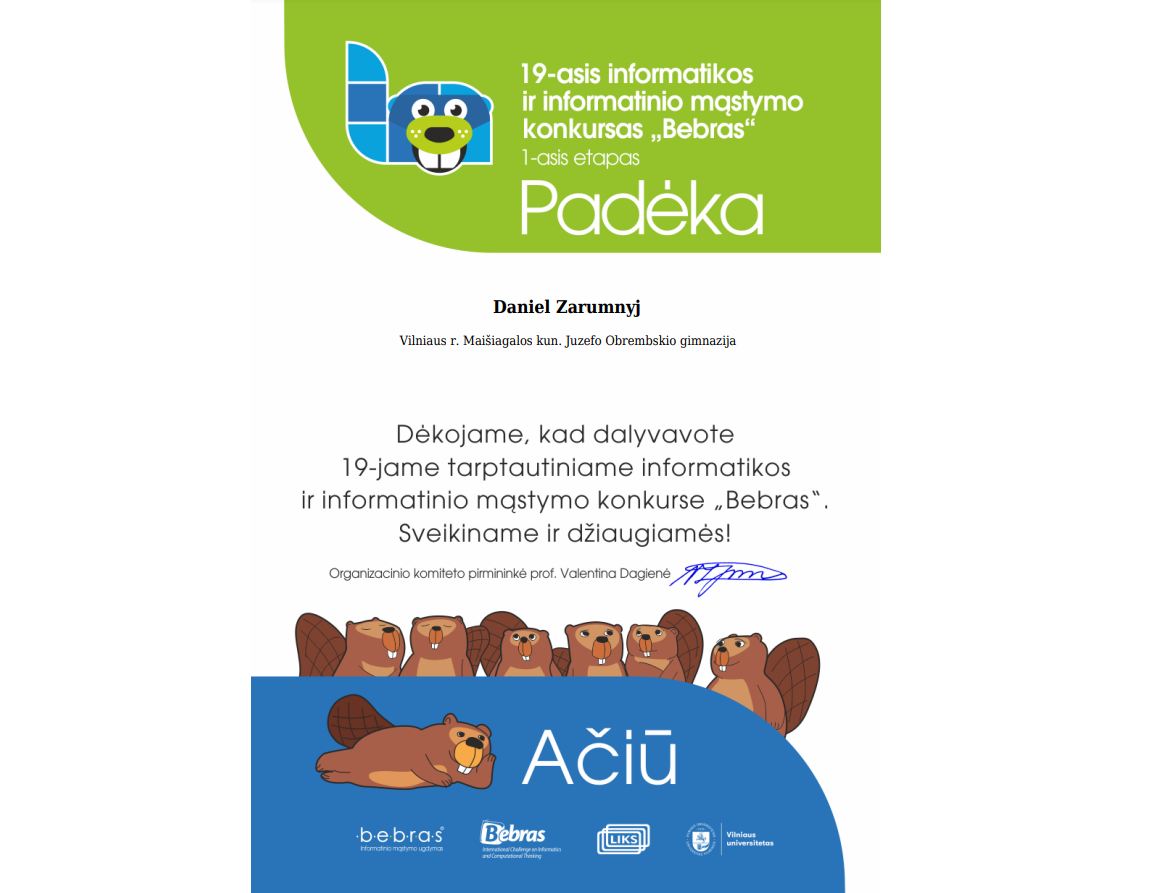 Uczniowie klas 6-IIIG naszego gimnazjum wzięli udział w międzynarodowym konkursie myśli informacyjnej „Bebras”. Uczeń klasy IIIG Daniel Zarumnyj zajął 3 miejsce w Samorządzie w I turze konkursu i brał udział w II turze konkursu.