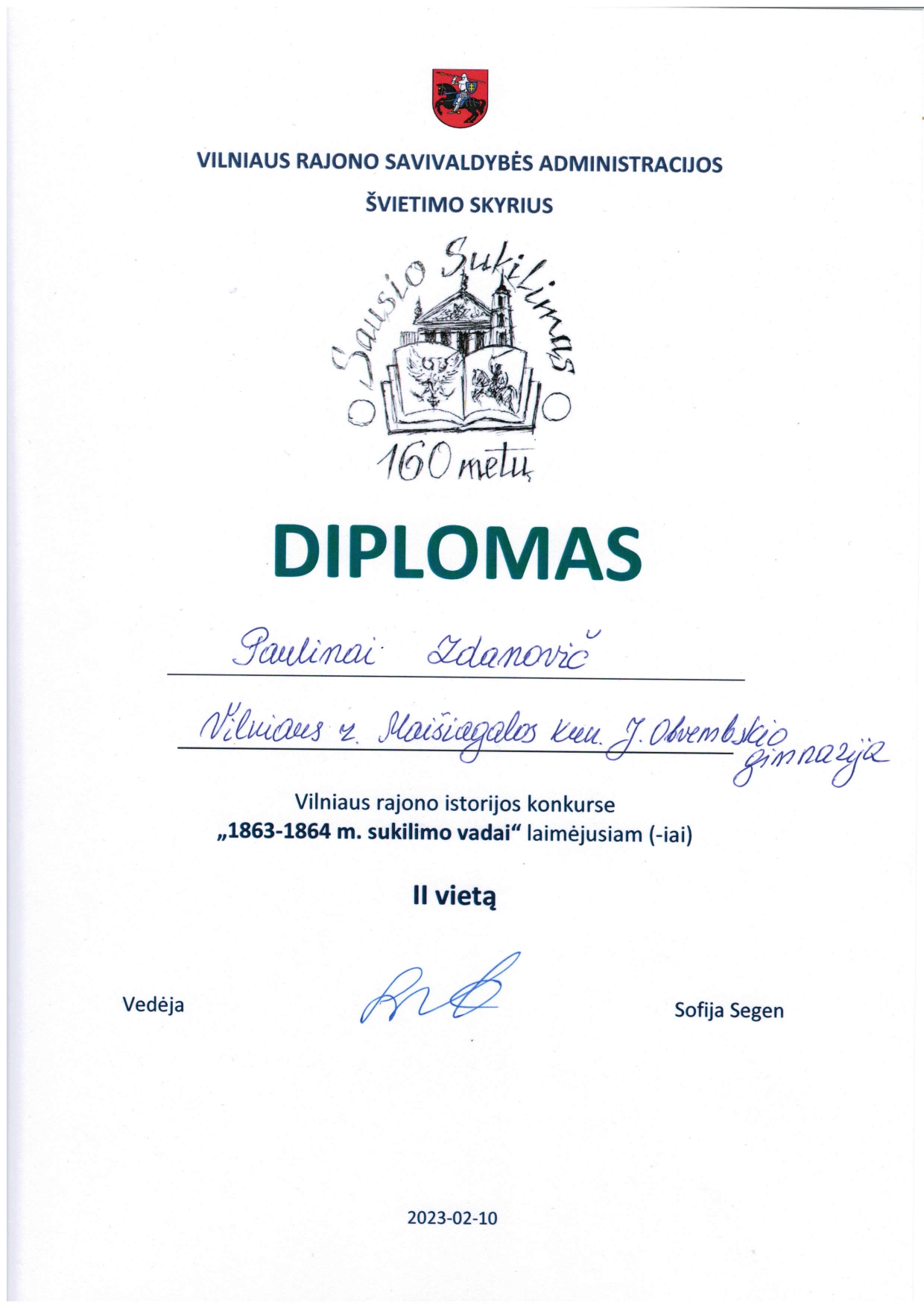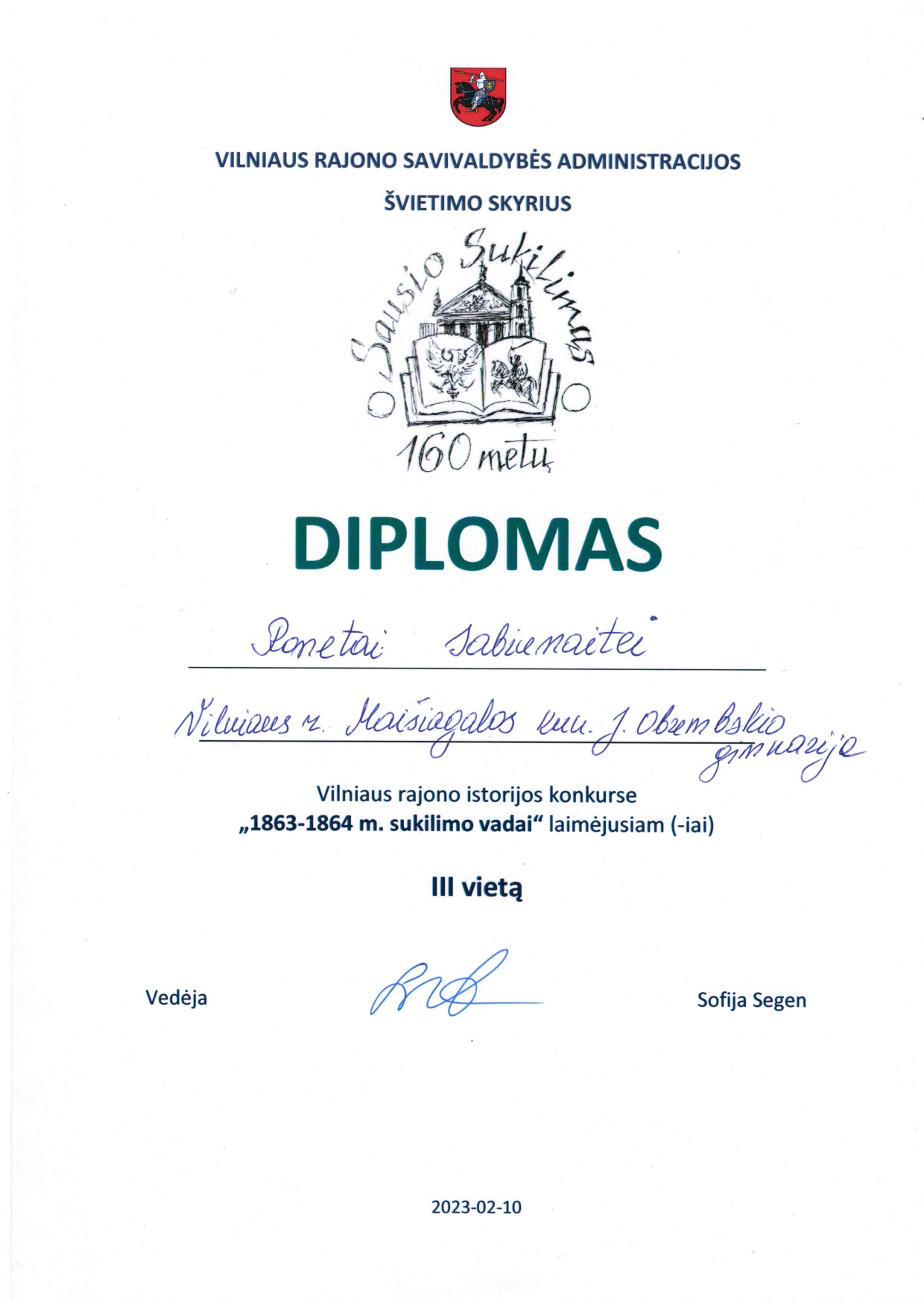 Zapisać w dziejach nieśmiertelne: Jestem! – napisał poeta Adam Asnyk o Powstaniu Styczniowym. 160. rocznica tego zrywu narodowego zapisuje kolejne ,,jestem” nowego pokolenia, które pielęgnując pamięć o wydarzeniach historycznych, buduje swoją tożsamość narodową. Uczniowie Gimnazjum im ks. Józefa Obrembskiego w Mejszagole aktywnie włączyli się do akcji zainicjowanej przez Samorządu Rejonu Wileńskiego. Przez cały styczeń trwały wydarzenia upamiętniające bohaterów powstania. Uczennice naszego gimnazjum Paulina Ewelina Zdanowicz (IIIG) i Roneta Sabiunaite (IIG) zajęły II i III miejsce, potwierdzając tym samym, że ocalenie pamięci historycznej jest ważnym zadaniem naszej szkoły.