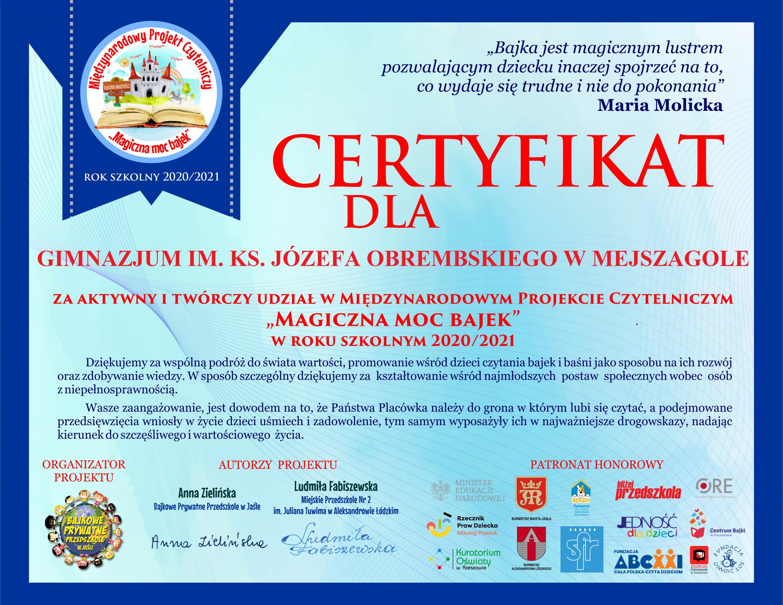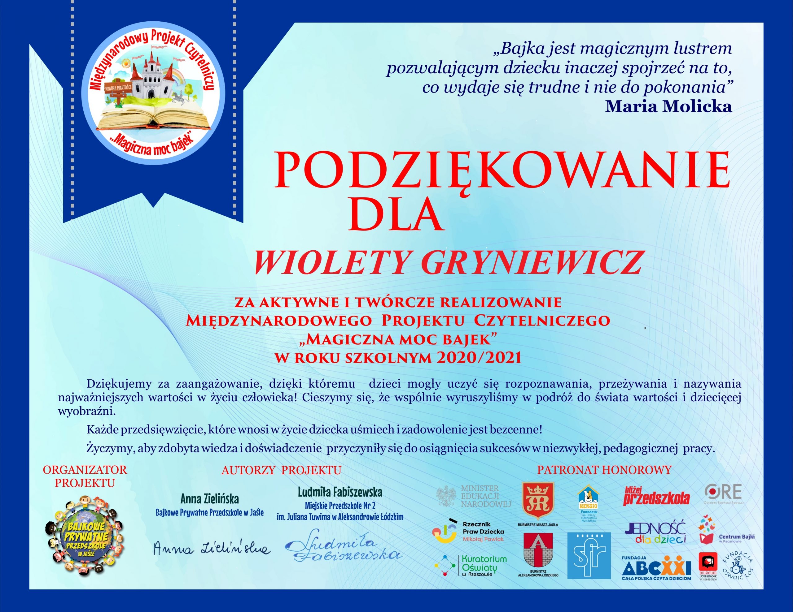 Priešmokyklinio ugdymo grupė šiais 2020/2021 mokslo metais dalyvavo tarptautiniame skaitymo projekte „Stebuklinga pasakų jėga“. Tai neįprasta iniciatyva, kurioje dalyvauja ne tik darželiai ir mokyklos iš visos Lenkijos, bet ir lenkų švietimo įstaigos užsienyje. Pagrindinis projekto tikslas yra skatinti pasakų skaitymą tarp vaikų, kaip jų raidos, ugdymo, žinių įgijimo ir laimingo žmogaus ugdymo būdą, taip pat formuoti ikimokyklinio amžiaus vaikų socialinę nuostatą žmonių su negalia atžvilgiu.