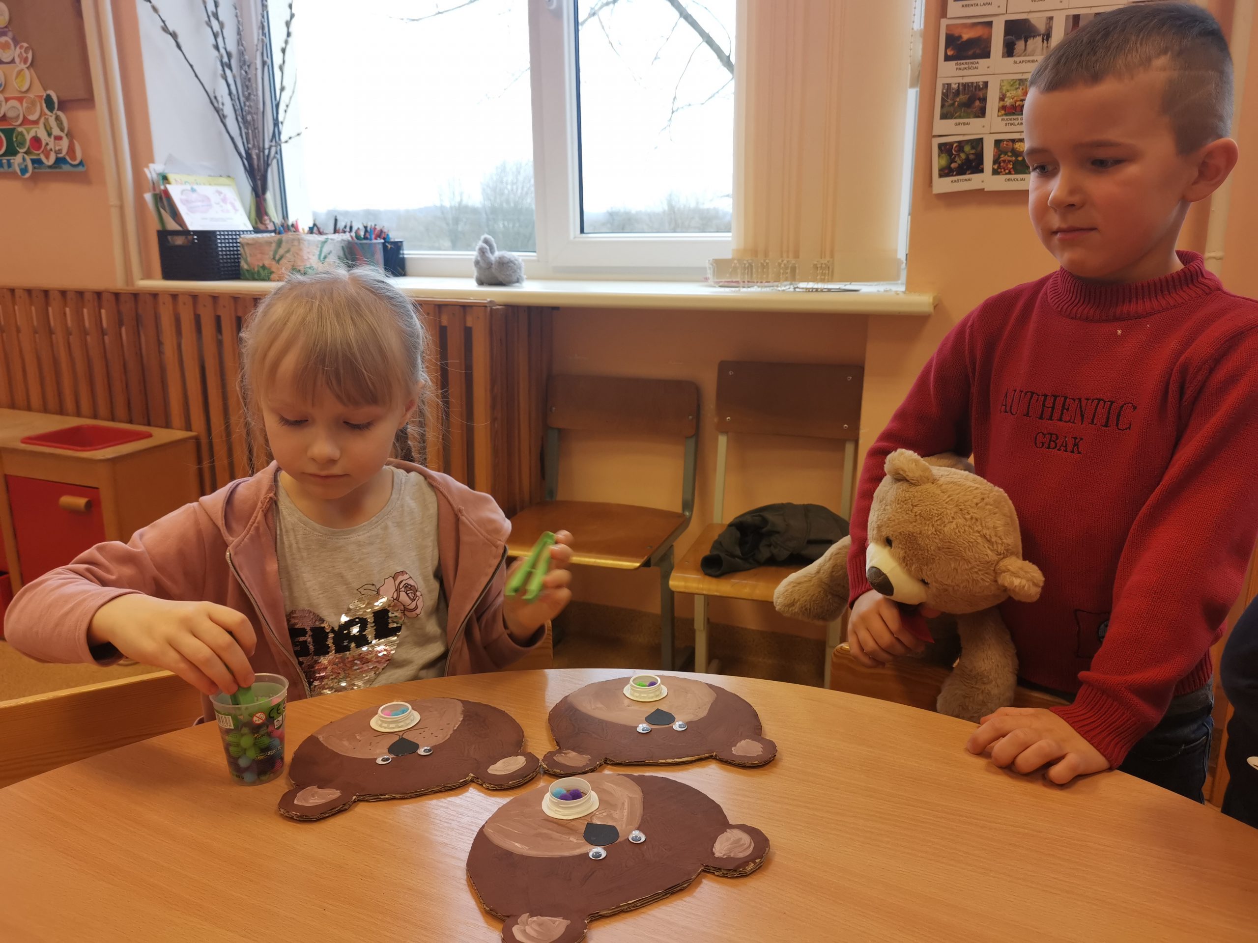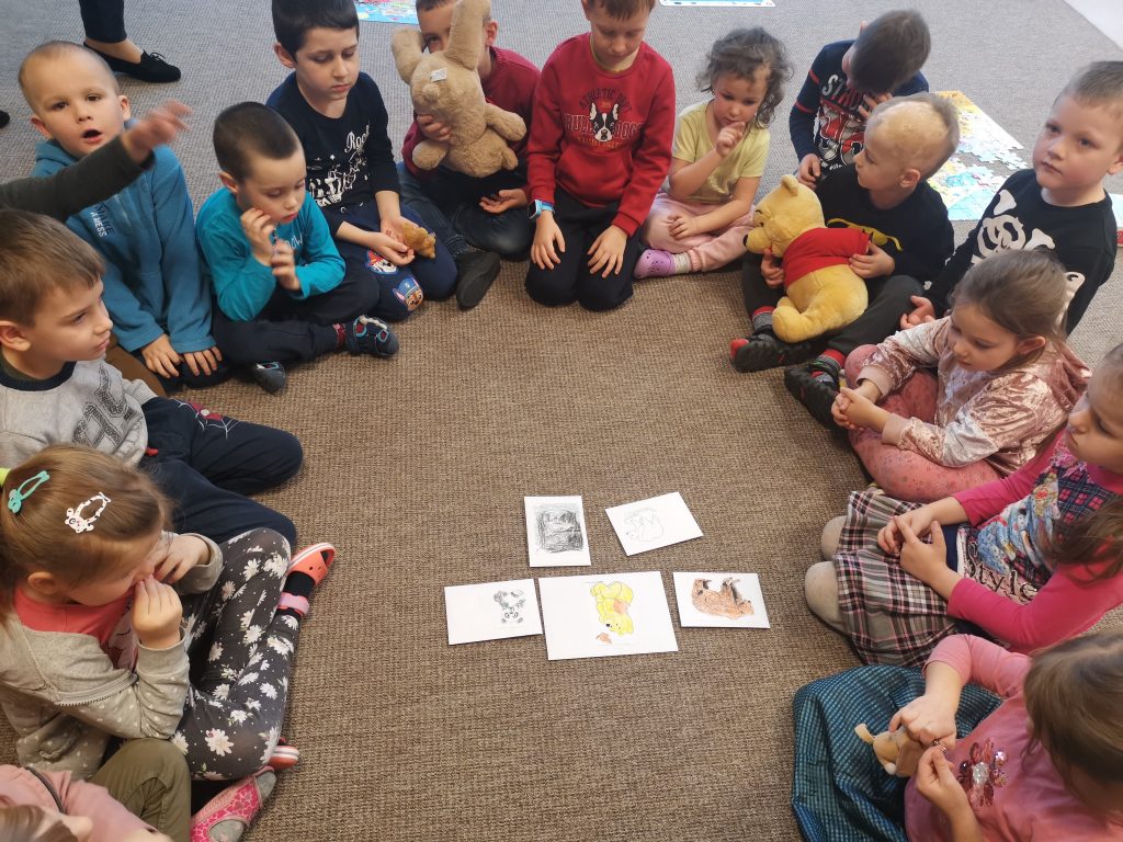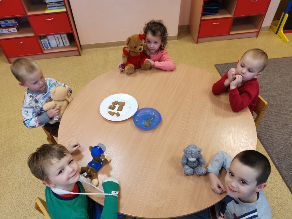 Vėliau vaikai pristatė savo meškiukus ir kitus žaislus: papasakojo iš kur juos gavo, kokie jų vardai, apibūdino jų išvaizdą, palygino su kitais meškiukais. Priešmokyklinukai, žinoma, išbandė kiekvieno meškiuko skanėstus – saldų medų.
