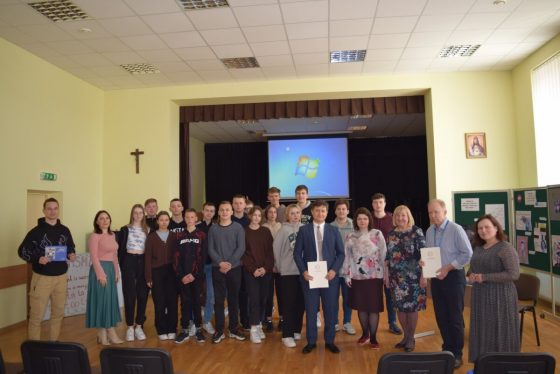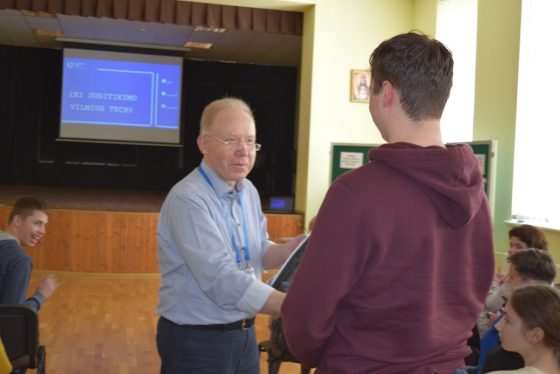 Antroje susitikimo dalyje VILNIUS TECH Stojančiųjų priėmimo ir informavimo centro vyriausiasis specialistas doc. dr. A. Jaras, naudodamasis šūkiu „Atrask savyje genijų!” gimnazijos bendruomenei papasakojo apie priėmimo į universitetą sąlygas. Jis nuotaikingai paaiškino moksleiviams, kodėl neverta rinktis bet kurio universiteto užsienyje vietoj Lietuvos universiteto, kodėl verta nesirinkti studijų krypties vien tik dėl jų gudraus pavadinimo, kad renkant studijų kryptį verta pagalvoti, ar po studijų galėsi dirbti gimtajame mieste. doc. dr. A. Jaras pristatė VILNIUS TECH fakultetus ir 2022/2023 m. m. studijų programas, supažindino su perspektyviausiomis specialybėmis, paskatino jaunimą rinktis studijas technologijų srityje, atsakė į rūpimus klausimus ir organizavo moksleiviams viktoriną apie VILNIUS TECH su originaliais prizais.