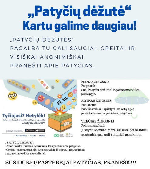 Mūsų gimnazija įdėgė elektroninę platformą „Patyčių dėžutė“, kuri yra skirta anoniminiams pranešimams apie smurto atvejus mokykloje mokiniams, jų tėvams ir mokytojams.