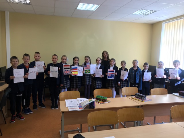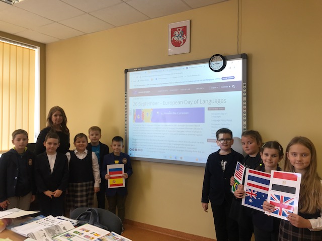Mokiniai išmoko naujų žodžių bei užtvirtino savo žinias atliekant kalbėjimo užduotis apie šalis, vėliavas.