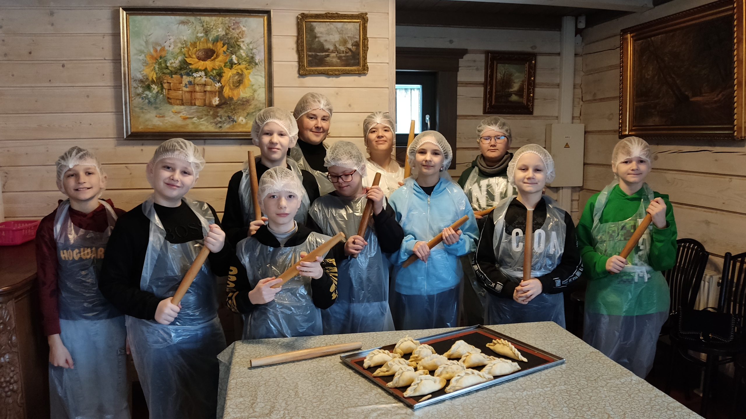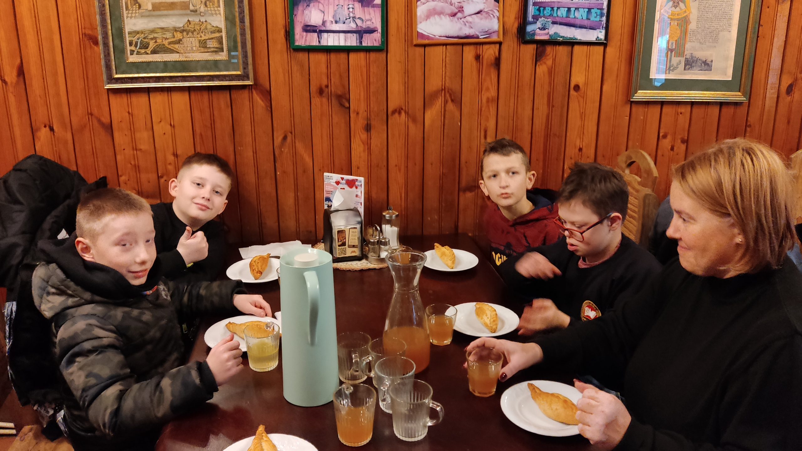 Pamokėlės pabaigoje paskanavome savo gamybos kibinų su karštu vištienos sultiniu ir stikline kmynų gėrimo.