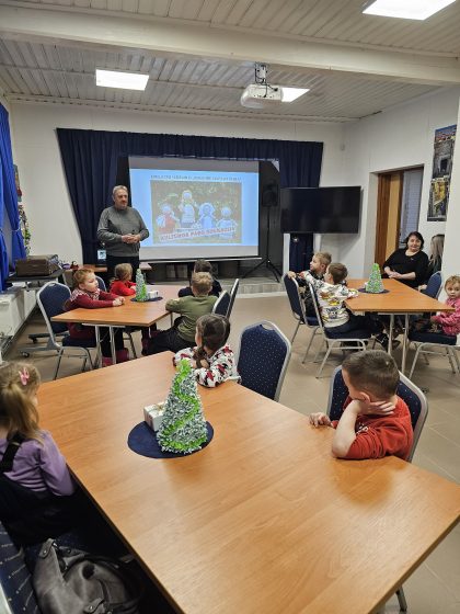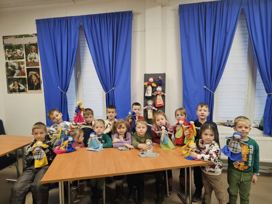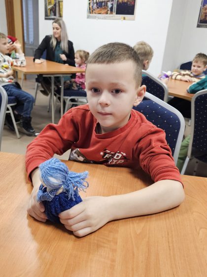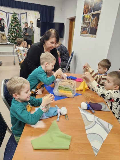 Vėliau su dideliu entuziazmu kibome į darbą. Iš audinių skiaučių, nenaudodami adatos ar siūlų, žingsnis po žingsnio kūrėme savo lėles, vyniodami medžiagą ir rišdami ją siūlais. Nors mazgų rišimas buvo tikras iššūkis, galutinis rezultatas sužavėjo – kiekviena lėlė buvo unikali! Pabaigoje vaikai savo lėlėms suteikė vardus, kas jiems suteikė daug džiaugsmo.