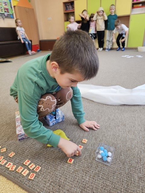 Vėliau laukė matematiniai iššūkiai – Sniego Senio matematika, suteikusi vaikams daug džiaugsmo ir pasitenkinimo. Sėkmingai įveikęs visas užduotis, Sniego Senis galėjo saugiai sugrįžti į savo apledėjusią Sniego šalį tolimoje šiaurėje. Šių nepaprastų akimirkų atminimui vaikai sukūrė gražius meninius darbelius su Sniego Seniu ir Mike Pūkuotuku bei įsiamžino prisiminimus fotografuodamiesi fotokabinoje.