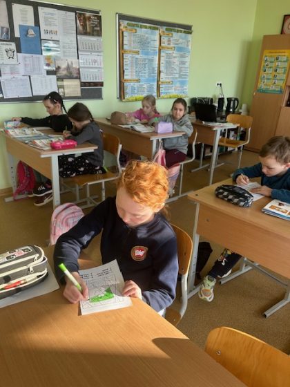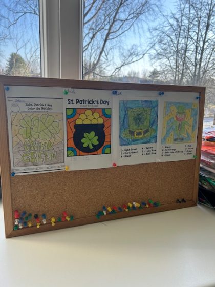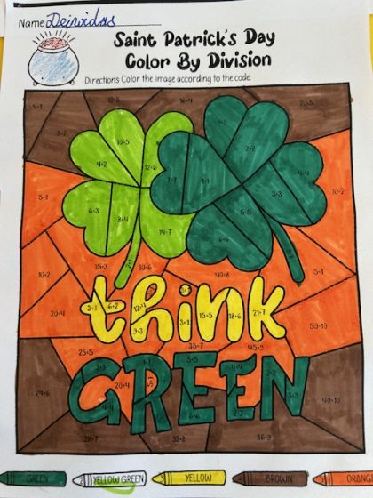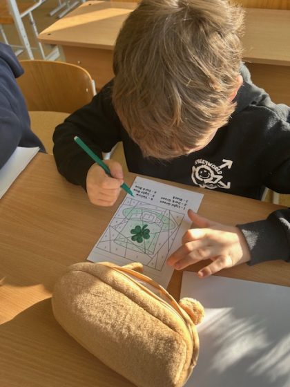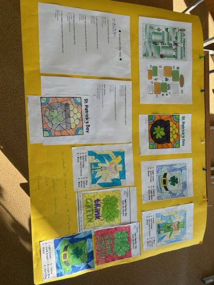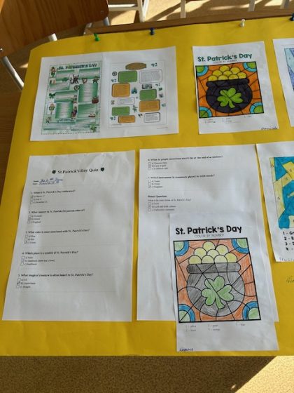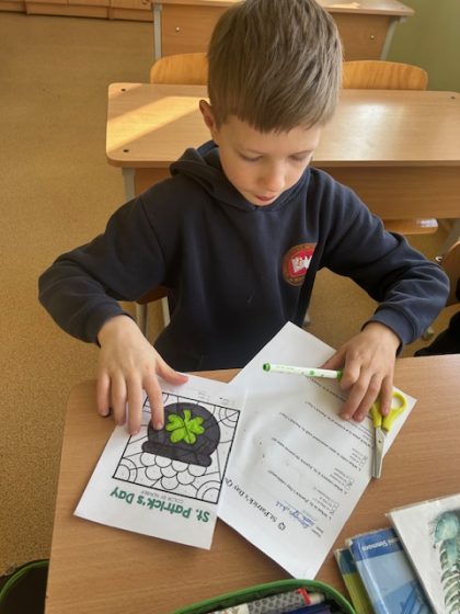 Kovo 16 dieną pradinukai dalyvavo anglų kalbos netradicinėje pamokoje, skirtoje Šv. Patriko dienai (kovo 17-ajai). Mokiniai susipažino su Airijos tradicijomis ir simboliais, sužinojo, kodėl ši diena siejama su žalia spalva bei dobilais.