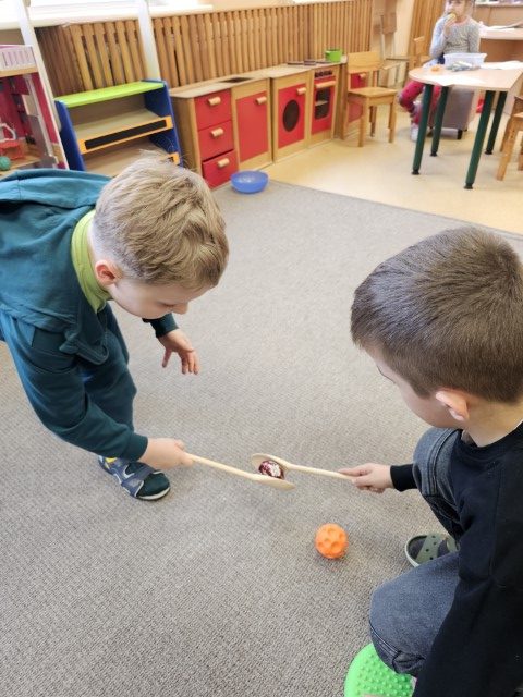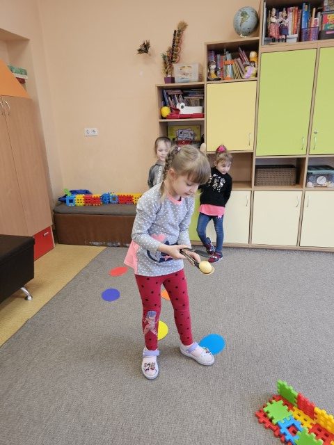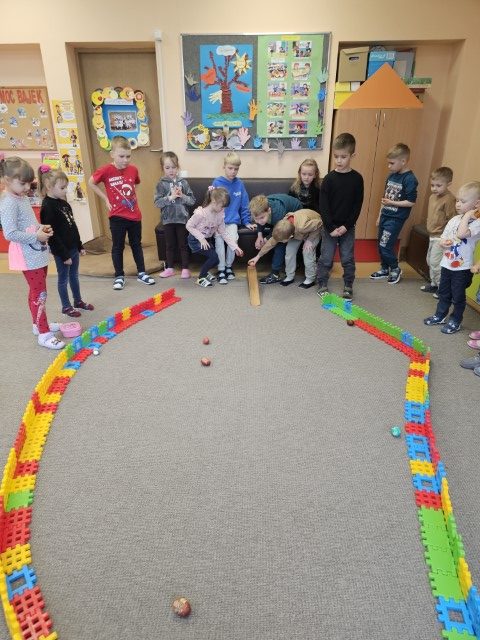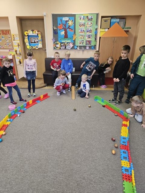 Vaikai demonstravo iš namų atsineštus gražius margučius ir pasidalijo, kaip juos margino. Vėliau prasidėjo linksmybės – margučių ridenimas ir smagus kliūčių ruožas su kiaušiniu ant šaukšto 🥚