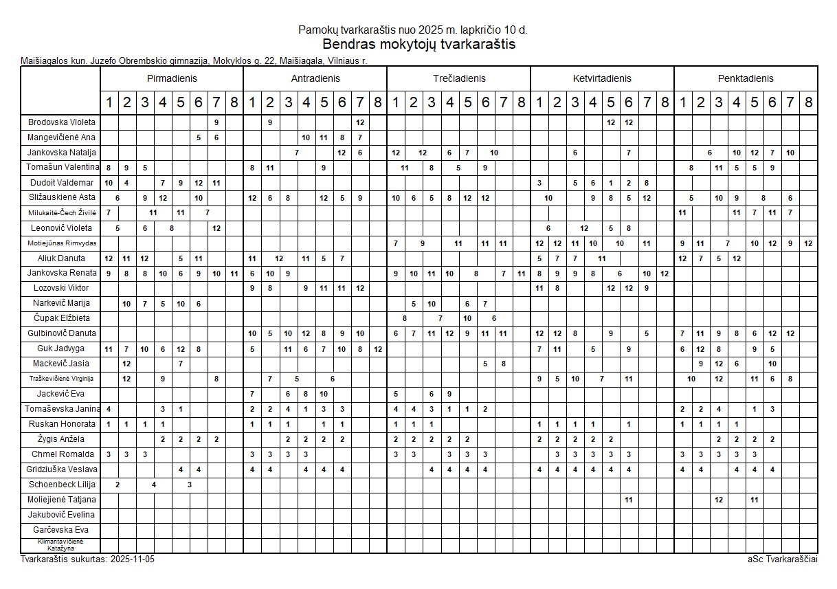 Vilniaus r. Maišiagalos kun. J. Obrembskio gimnazijos pamokų tvarkaraštis 2025-2026